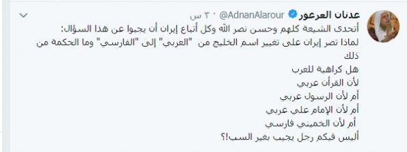 وقال العرعور، في تغريدة اطلعت عليها “عناوين ” عبر حسابه في “تويتر”: ” أتحدى حسن نصر الله وكل أتباع إيران أن يجيبوا عن هذا السؤال: لماذا تصر إيران على تغيير اسم الخليج من “العربي” إلى “الفارسي” وما الحكمة من ذلك؟”.