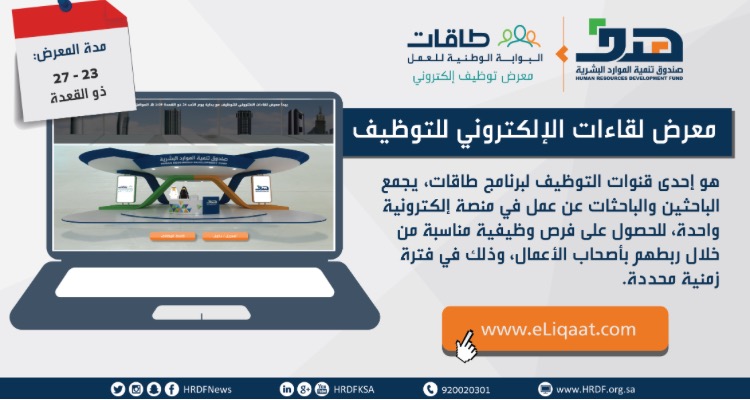 تعرض 129 منشأة في القطاع الخاص ما يقارب 8000 فرص عمل شاغرة لديها أمام المواطنين والمواطنات، وذلك في معرض لقاءات الإلكتروني الثاني عشر الذي ينظمه صندوق تنمية الموارد البشرية (هدف).