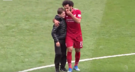 بالصور.. طفل إنجليزي يقتحم ملعب أنفيلد ليتحدث لمحمد صلاح