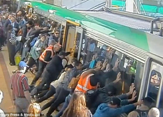 وبسرعة بديهه، وبعد تنبيه سائق القطار بعدم التحرك، تجمع الركاب وعمال المحطة سويًا وقاموا بهز القطار بقوة، لإنقاذ قدم الرجل التي كان يعتصرها قطار يزن 10 آلاف طن.