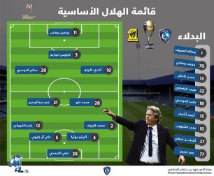 ونشر حساب الهلال على تويتر صورة بأسماء التشكيلة النهائية، اطلعت عليها “عناوين” متضمنة توزيع الاعبين داخل المستطيل الأخضر، واللاعبين الاحتياطين.