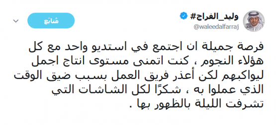 وكتب الفراج، في تغريدة اطلعت عليها “عناوين” عبر حسابه في”تويتر”:” فرصة جميلة ان اجتمع في استديو واحد مع كل هؤلاء النجوم ، كنت اتمنى مستوى انتاج اجمل ليواكبهم لكن أعذر فريق العمل بسبب ضيق الوقت الذي عملوا به ، شكرًا لكل الشاشات التي تشرفت الليلة بالظهور بها”.