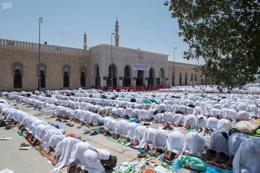 توافدت جموع غفيرة من حجاج بيت الله الحرام منذ وقت مبكر إلى مسجد نمرة في مشعر عرفات اليوم لأداء صلاتي الظهر والعصر جمعاً وقصراً ؛ اقتداء بسنة النبي المصطفى محمد صلى الله عليه وسلم والاستماع لخطبة عرفة .