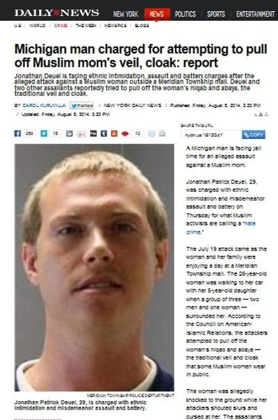 اعتدى شاب أمريكي يدعى جوناثان ديويل (29 عاما) على مبتعثة سعودية وابنتها ونزع نقابها وحاول نزع عبائتها ثم أسقطها أرضا بأحد شوارع ولاية ميتشجان . وبحسب مصادر صحفية أمريكية فإن جوناثان يواجه عقوبة السجن لمدة عامين وغرامة مالية قدرها 5 آلاف دولار، وذلك بعد أن وجهت له محكمة أمريكية تهمة ارتكاب جريمة كراهية وعنصرية .