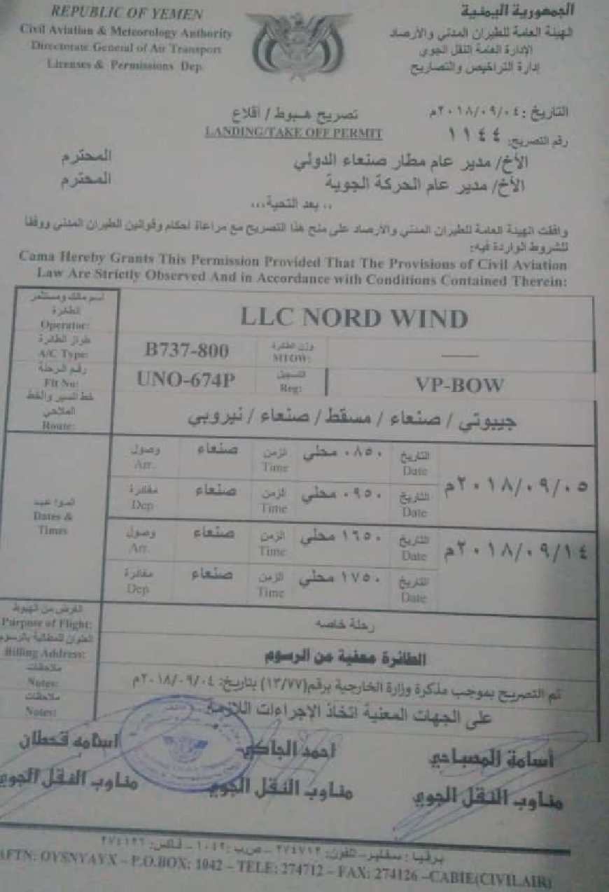 وحصل المشهد اليمني على صورة من التصريح الرسمي بالموافقة على إقلاع طائرة وفد الحوثيين من مطار صنعاء موضحاً خط سيرها.