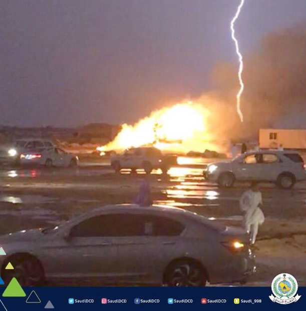 وأكدت إمارة مكة المكرمة، أن صاعقة ضربت مقطورة شاحنة محملة بالأعلاف في منطقة حضن على طريق الطائف – الرياض، تسببت في احتراقها، بينما لم تسجل أي إصابات.