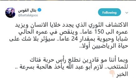 وكتب القوس في تغريدة طريفة نشرها على حسابه بموقع “تويتر”: الاكتشاف الثوري الذي يجدد خلايا الانسان ويزيد عمره الى 150 عاما.. وينقص في عمره الحالي شبابا وحيوية بمقدار 24 عاما.. سيؤثر بلا شك على حياة الرياضيين أولا”.