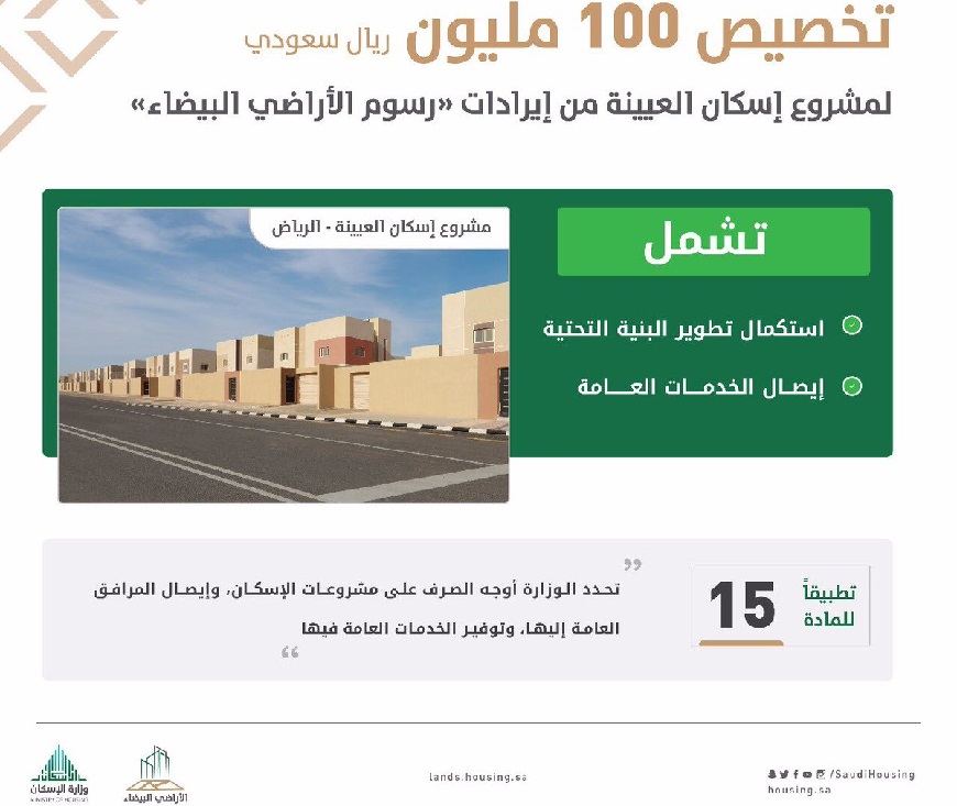 كشف برنامج (رسوم الأراضي البيضاء) التابع لوزارة الإسكان، عن تخصيصه مبلغ 100 مليون ريال لاستكمال تنفيذ وإيصال خدمات البنية التحتية في مشروع (إسكان العيينة) بمنطقة الرياض، مبيناً أن هذا المبلغ يمثل جزء من إيرادات البرنامج التي تم تحصيلها من الرسوم المفروضة على الأراضي البيضاء داخل النطاق العمراني في مرحلته الأولى.