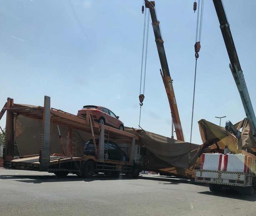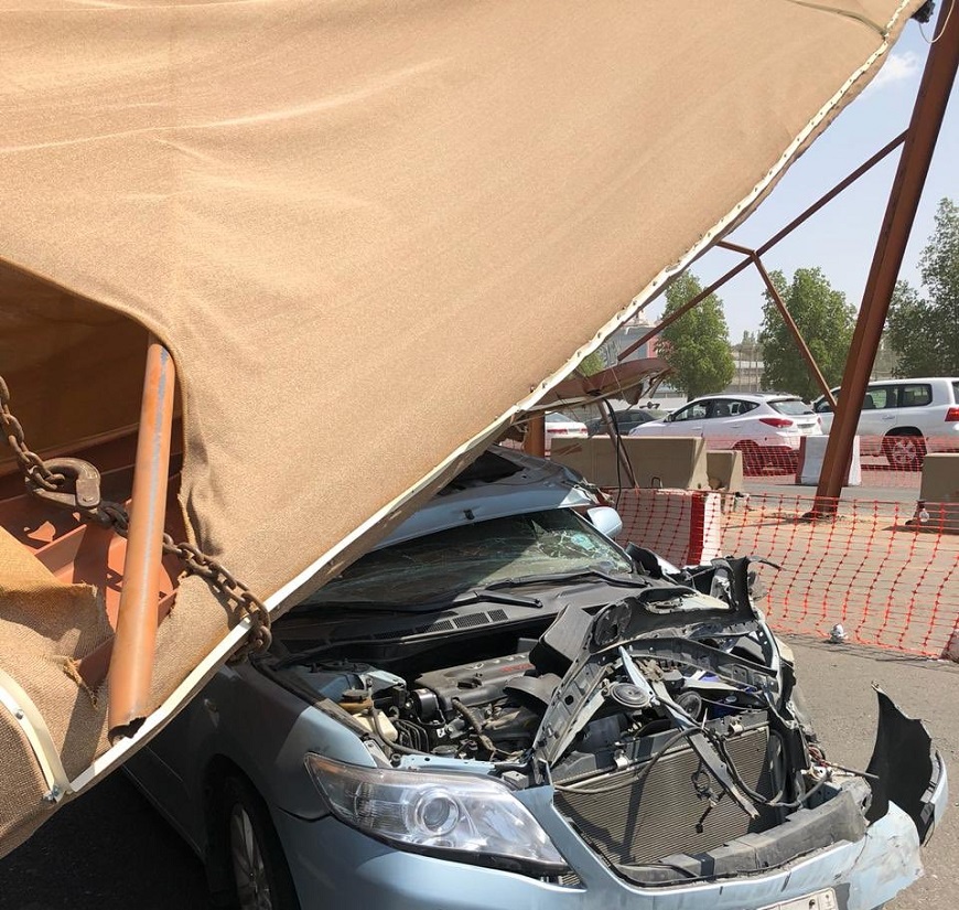 تسبب سقوط مظلة كبیرة، الیوم الأربعاء (العاشر من أكتوبر 2018م)، فوق شاحنة محملة بالمركبات في تدمير عدة سيارات بإحدى نقاط التفتیش الموسمیة بالشرائع بمكة المكرمة.