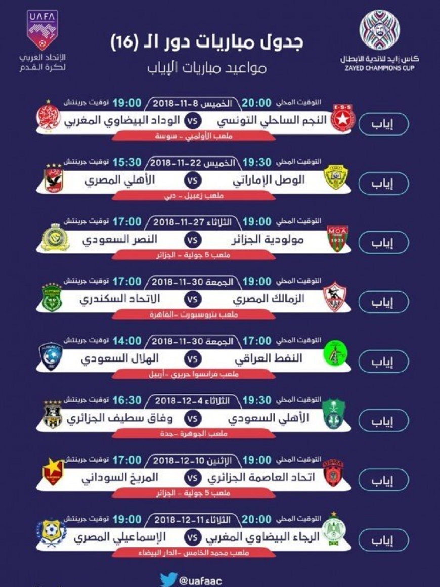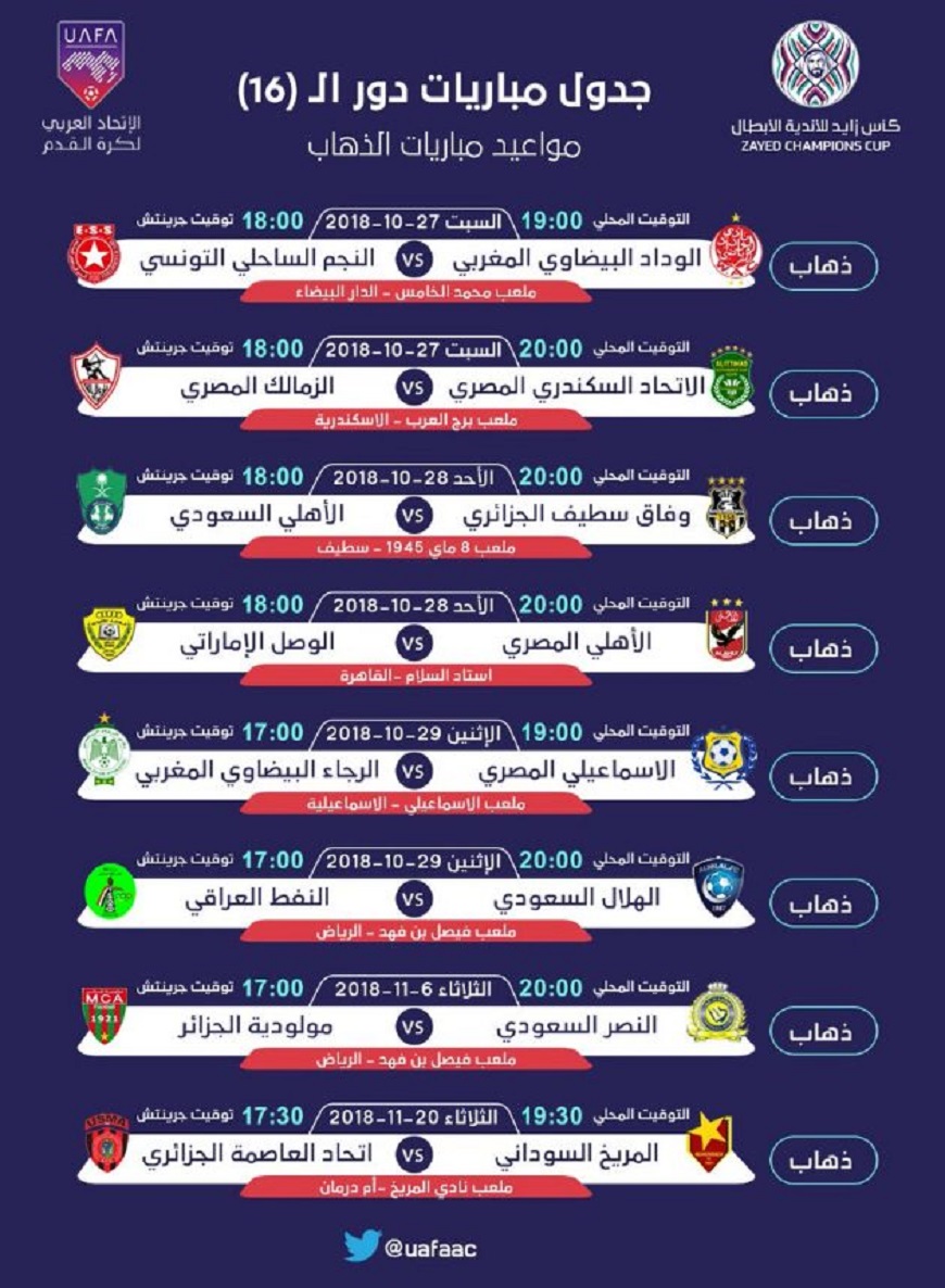 أصدر الاتحاد العربي لكرة القدم، اليوم الأحد (14 أكتوبر 2018م)، جدول مباريات دور الـ 16 من بطولة كأس زايد للأندية الأبطال، وذلك بعدما اتفقت مؤخراً جميع الأندية الـ 16 المتأهلة على هامش قرعة هذا الدور التي أجريت مؤخراً بمدينة الرياض، على المواعيد المناسبة لها لمباريات الذهاب والإياب وعلى الملاعب التي ستقام عليها المواجهات، وذلك في حضور ممثلي الاتحادات الأهلية واللجنة المنظمة للبطولة.