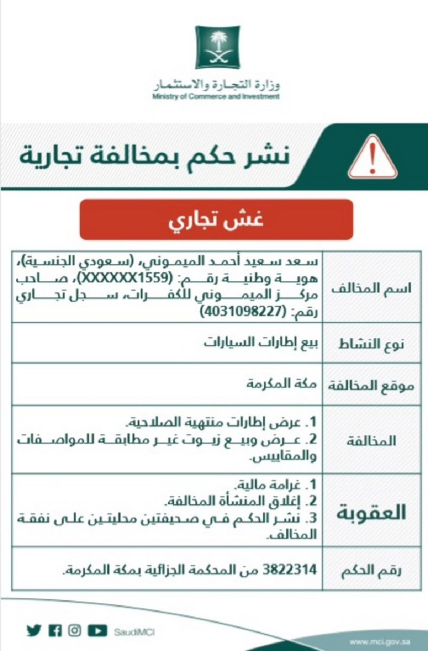 شهَّرت وزارة التجارة والاستثمار، بصاحب منشأة بمدينة مكة المكرمة؛ وذلك بعد صدور حكم قضائي بإدانته، وثبوت تورُّط المنشأة المخالفة في حيازة وعرض إطارات سيارات منتهية الصلاحية، إضافة إلى قيامها بعرض وبيع الزيوت غير المطابقة للمواصفات والمقاييس؛ وهو ما يعد غشًّا وتضليلاً للمشتري.
