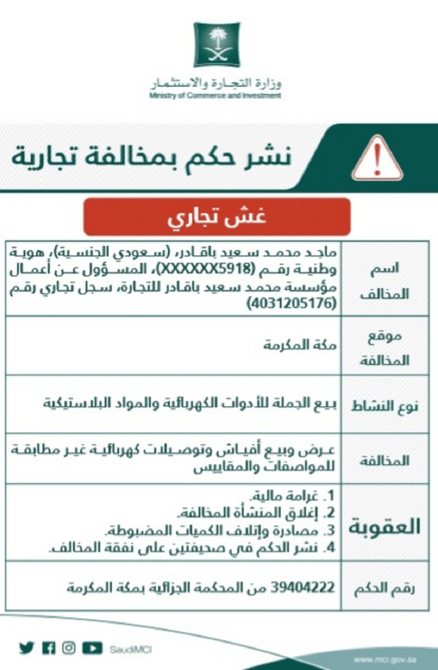 شهَّرت وزارة التجارة والاستثمار، الأربعاء (31 أكتوبر 2018م)، بمؤسسة تختص بتجارة بيع الجملة للأدوات الكهربائية والمواد البلاستيكية بمكة المكرمة؛ وذلك بعد صدور حكم قضائي بإدانة المسؤول عنها، وثبوت تورطه في عرض وبيع منتجات كهربائية غير مطابقة للمواصفات والمقاييس المعتمدة، وهو ما يعد غشًّا وتضليلاً للمشتري، ويشكِّل استخدامها خطرًا على سلامة المستهلكين.