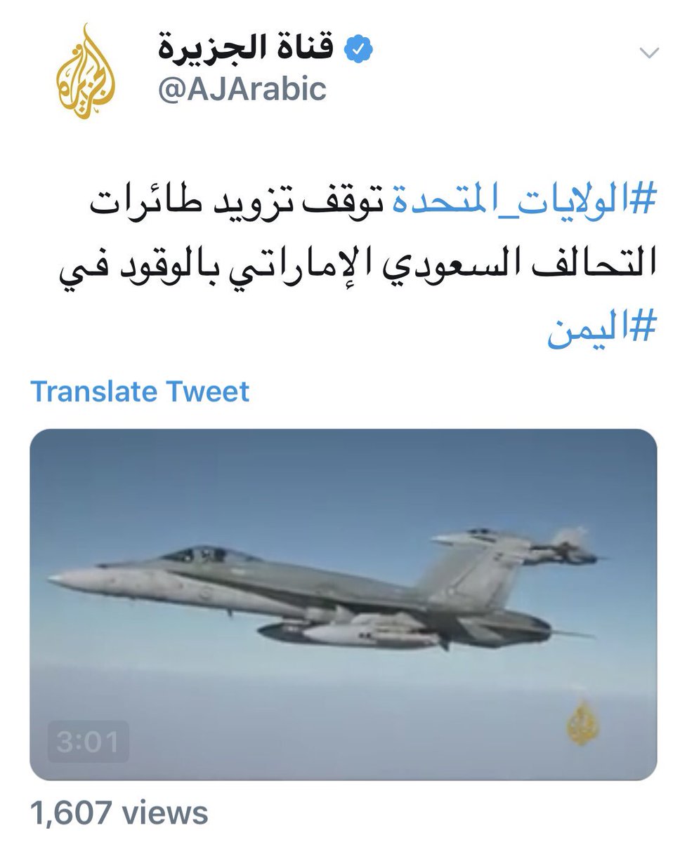 فضح مغردون على موقع “تويتر” كذب قناة الجزيرة القطرية بشأن قرار تحالف دعم الشرعية في اليمن بقيادة السعودية مطالبة الولايات المتحدة الأمريكية بوقف تزويد مقاتلات التحالف بالوقود في أجواء اليمن.