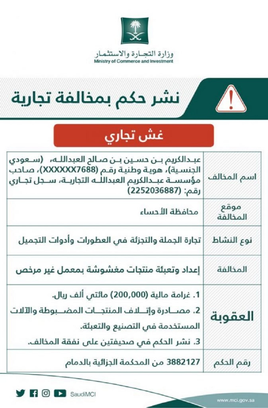عاقبت وزارة التجارة والاستثمار، الأربعاء (14 نوفمبر 2018م)، صاحب منشأة تختص في تجارة الجملة والتجزئة في العطور وأدوات التجميل بمحافظة الأحساء، بالتشهير، وذلك إثر ثبوت تورطه في إعداد وتعبئة منتجات مغشوشة بمعمل غير مرخص؛ وذلك بهدف تصريفها وبيعها في الأسواق؛ وهو ما يعد غشاً تجارياً وإيهاماً وتضليلاً للمستهلكين بجودتها.
