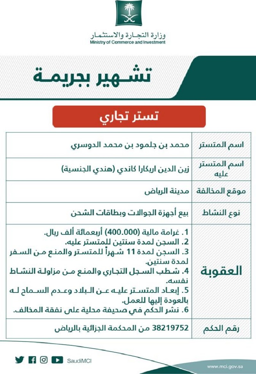 شهرت وزارة التجارة والاستثمار، الخميس (22 نوفمبر 2018م)، بمواطن ووافد من جنسية آسيوية بمدينة الرياض، بعد صدور حكم قضائي بإدانتهم بجريمة التستر التجاري وغسل الأموال وثبوت تمكين المواطن للوافد من العمل لحسابه الخاص في قطاع الاتصالات عبر مؤسسة تزاول نشاط التجارة ببيع أجهزة الجوالات وبطاقات الشحن، إذ تبين استغلال السجل التجاري للمنشأة وتصرف المتستر عليه في استخدام حساباتها البنكية تصرف المالك، وتسيير أعمالها.