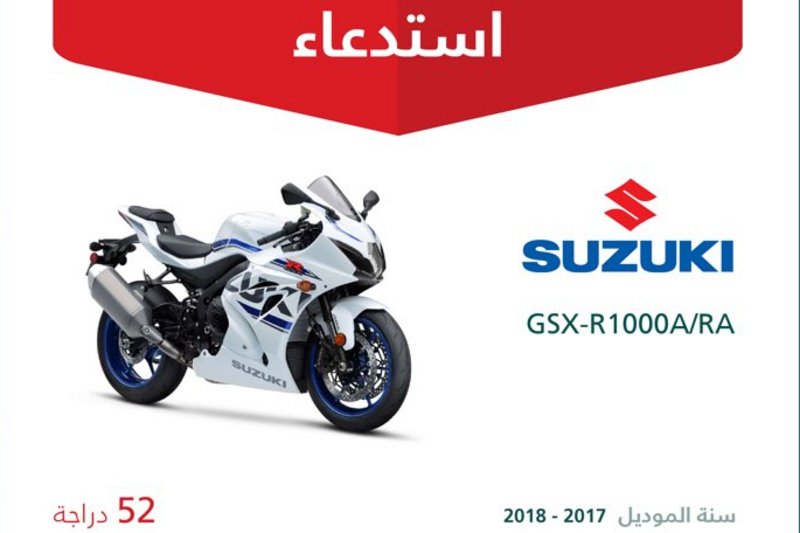 أعلنت وزارة التجارة والاستثمار عن استدعاء طرازين من دراجات “سوزوكي 2017 – 2018″؛ نظراً لخلل في مضخة الوقود قد يؤدي إلى تسربه، مما يزيد من احتمالية نشوب حريق.