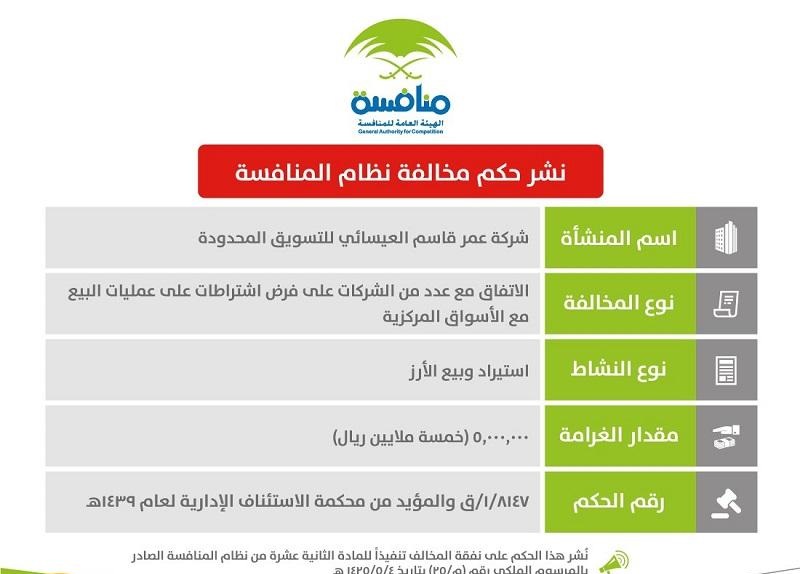 قامت الهيئة العامة للمنافسة بالتشهير بشركة عمر قاسم العيسائي للتسويق المحدودة والتي تعمل في مجال استيراد وبيع الأرز وغرمتها 5 ملايين ريال.