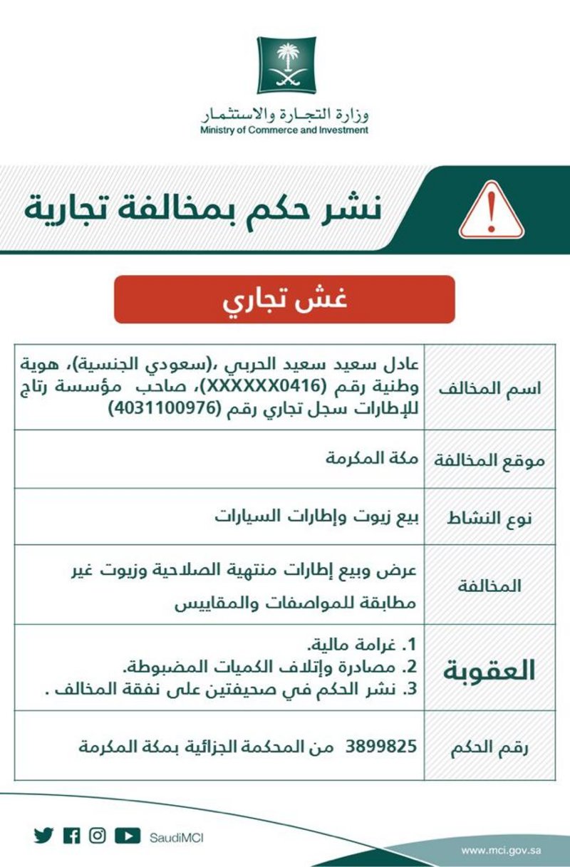 شهرت وزارة التجارة والاستثمار بصاحب مركز خدمات صيانة وإصلاح إطارات وزيوت السيارات بمكة المكرمة، وذلك بعد صدور حكم قضائي بإدانته وثبوت تورط المنشأة المخالفة في عرض وبيع إطارات منتهية الصلاحية وزيوت غير مطابقة للمواصفات القياسية وهو ما يعد غشاً وتضليلاً للمشتري بالنظر لما تشكله تلك السلع من خطورة على سلامة مستخدميها.