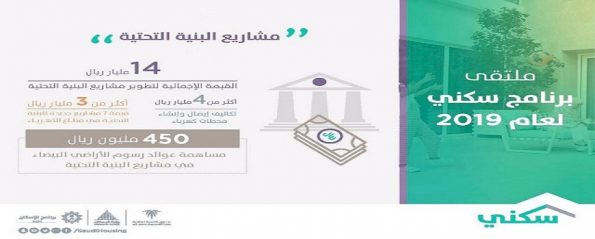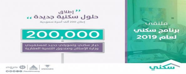 أعلنت وزارة الإسكان، الثلاثاء (15 يناير 2019م)، تفاصيل برنامج «سكني 2019»، كاشفة عن 100 ألف قرض عقاري مدعوم الأرباح دفعة واحدة للمستفيدين، وتخصيص 200 ألف أسرة من «برنامج سكني لعام 2019»، متعهدةً بتقديم المزيد للمستفيدين.
