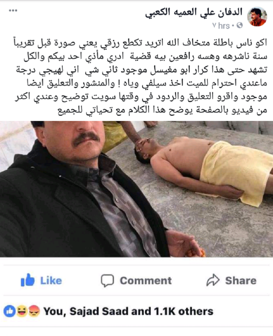 أثارت صورة سيلفي، لحفّار قبور شهير في محافظة النجف، مكنى بـ«علي العَمية»، مع جنازة شاب ضجة في العراق، وردودا شعبية ورسمية، لا سيما بعد اتهام «الدفان» بإهانة حرمة الموتى.
