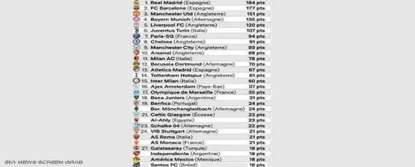 وحل ريال مدريد الإسباني في المرتبة الأولى متبوعا بغريمه التقليدي برشلونة، أما فريق مانشستر يونايتد فحل في المرتبة الثالثة، بحسب ما نقلت صحيفة «ماركا».