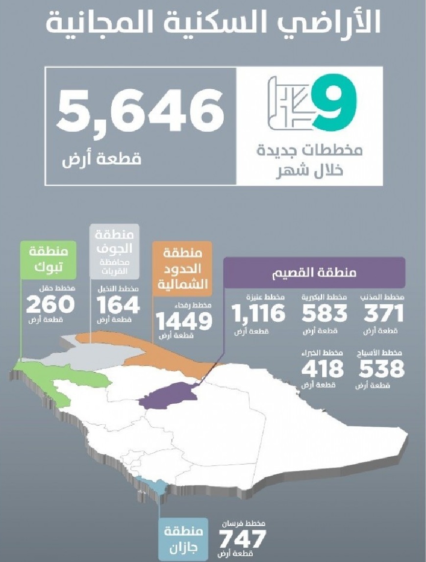وأضاف البرنامج أربع مخططات أخرى موزعة بين عدد من المناطق والمحافظات، شملت مخطط النخيل بواقع (164) قطعة أرض بمحافظة القريات التابعة لمنطقة الجوف، ومخطط منح واحد في محافظة رفحاء التابعة للحدود الشمالية، يضم (1449) قطعة أرض، في حين حظيت تبوك بمخطط حقل الذي يضم (260) قطعة أرض، وفي جزر فرسان التابعة لمنطقة جازان أضيف مخطط جديد، يجمع أراضٍ بلغ عددها (748) أرضًا.
