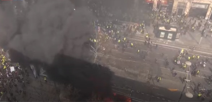 وبدأت أعمال العنف عندما ألقى متظاهرون قنابل دخان وغيرها من الأشياء على عناصر الشرطة في جادة الشانزلزيه، ثم بدأوا بالطرق على نوافذ شاحنة للشرطة.في وقت لاحق، أطلق مدفع مياه زخات قوية من شارع جانبي في محاولة لرد محتجين تجمعوا بين متجر لكارتييه وآخر لمونت بلانك.