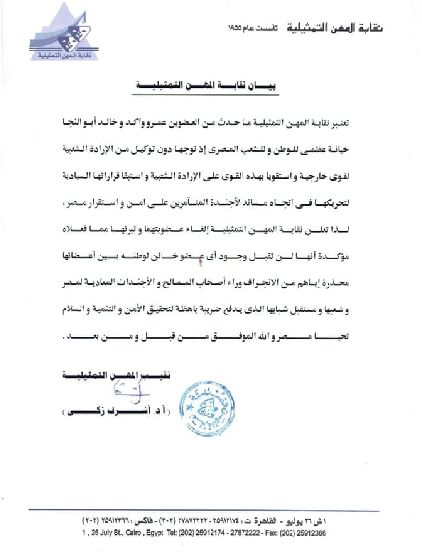 ألغت نقابة المهن التمثيلية في مصر بقيادة أشرف زكي نقيب الممثلين، عضوية الفنانين عمرو واكد وخالد أبو النجا، بعد تصريحاتهما التي اعتبرت مسيئة إلى مصر، وذهابهما إلى الكونغرس لتقديم شكاوى ضد بلدهما.