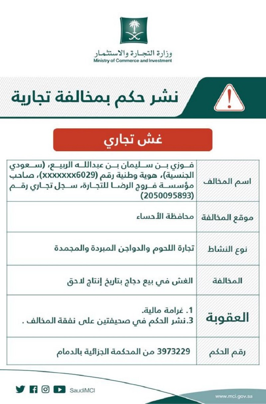 شهرت وزارة التجارة والاستثمار، الأربعاء (الثالث من ابريل 2019م، بصاحب مؤسسة تختص بتجارة الجملة والتجزئة في اللحوم والدواجن المبردة والمجمدة بمحافظة الأحساء، وذلك إثر تورط القائمين عليها بمخالفة نظام مكافحة الغش التجاري وعرض كميات من الدجاج تحمل تواريخ إنتاج لاحقة لتاريخ إنتاجها الحقيقي وهو ما يعد مخالفة تستوجب العقوبة بالنظر لما يتضمنه من إيهام وتضليل للمستهلك.