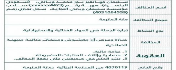 وتضمن الحكم الصادر من المحكمة الجزائية بمكة المكرمة فرض غرامة مالية على المخالف ومصادرة وإتلاف الكميات المضبوطة، والتشهير عبر نشر الحكم في صحيفة محلية على نفقة المخالف.
