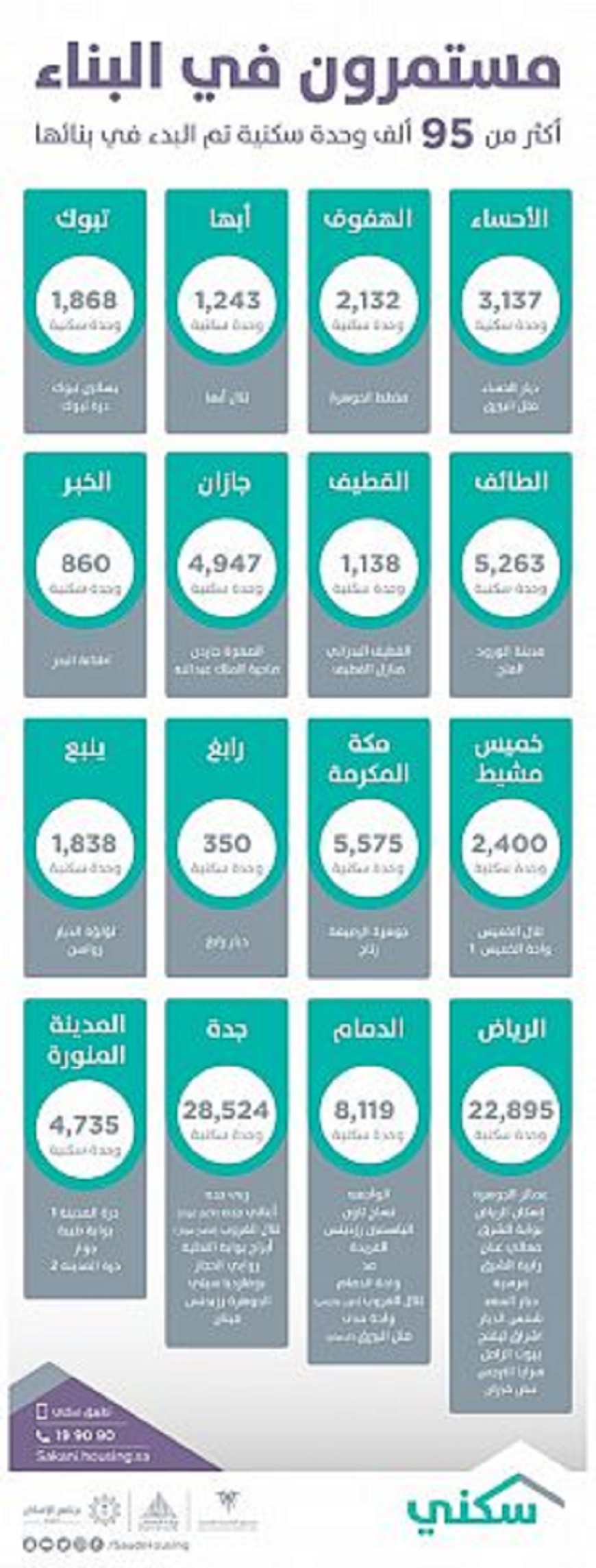 يذكر أن “سكني” قد أعلن في منتصف يناير الماضي عن البدء في بناء 45 مشروعًا سكنيًا موزعة على 16 مدينة مختلفة، تلاها مشروعين في مارس الماضي بالإضافة إلى المشاريع الـ 6 الحالية ليصل اجماليها 53 مشروعًا سكنيًا توفر أكثر من 95 ألف وحدة سكنية، كما أعلن البرنامج عن أسماء 200 ألف مواطن يمكنهم الاستفادة هذا العام من الخيارات المتنوعة التي يوفرها برنامج “سكني 2019″، التي تتيح الوحدات السكنية الجاهزة ضمن مشاريع الوزارة والوحدات تحت الإنشاء بالشراكة مع المطورين العقاريين والأراضي المجانية والقروض العقارية المدعومة للاستفادة من شراء الوحدات الجاهزة من السوق، والبناء الذاتي لمن يملكون الأراضي، وتمويل القرض القائم، انطلاقاً من استهداف تسريع التملّك ورفع نسبته إلى 60% بحلول عام 2020 وإلى 70% بحلول عام2030 وفقاً لأهداف برنامج الإسكان “أحد برامج رؤية المملكة 2030″، وتقليص قوائم الانتظار وإتاحة فرص سكنية أكثر تلائم مختلف فئات المجتمع في كل مناطق المملكة.