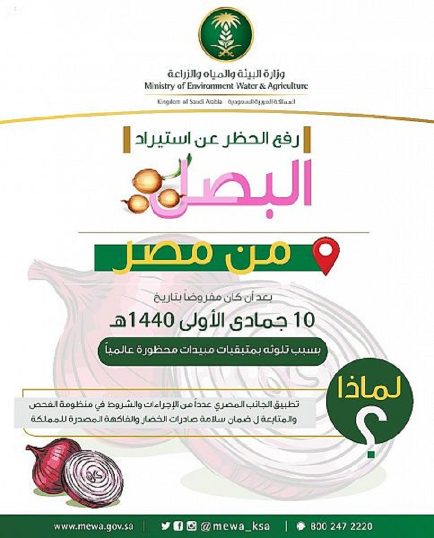 رفعت وزارة البيئة والمياه والزراعة، الأحد (26 مايو 2019م)، الحظر عن استيراد البصل من جمهورية مصر العربية بعد أن كانت فرضته بتاريخ 10 جمادى الأولى 1440هـ بسبب وجود نسب أعلى من المسموح بها عالميا من متبقيات المبيدات.