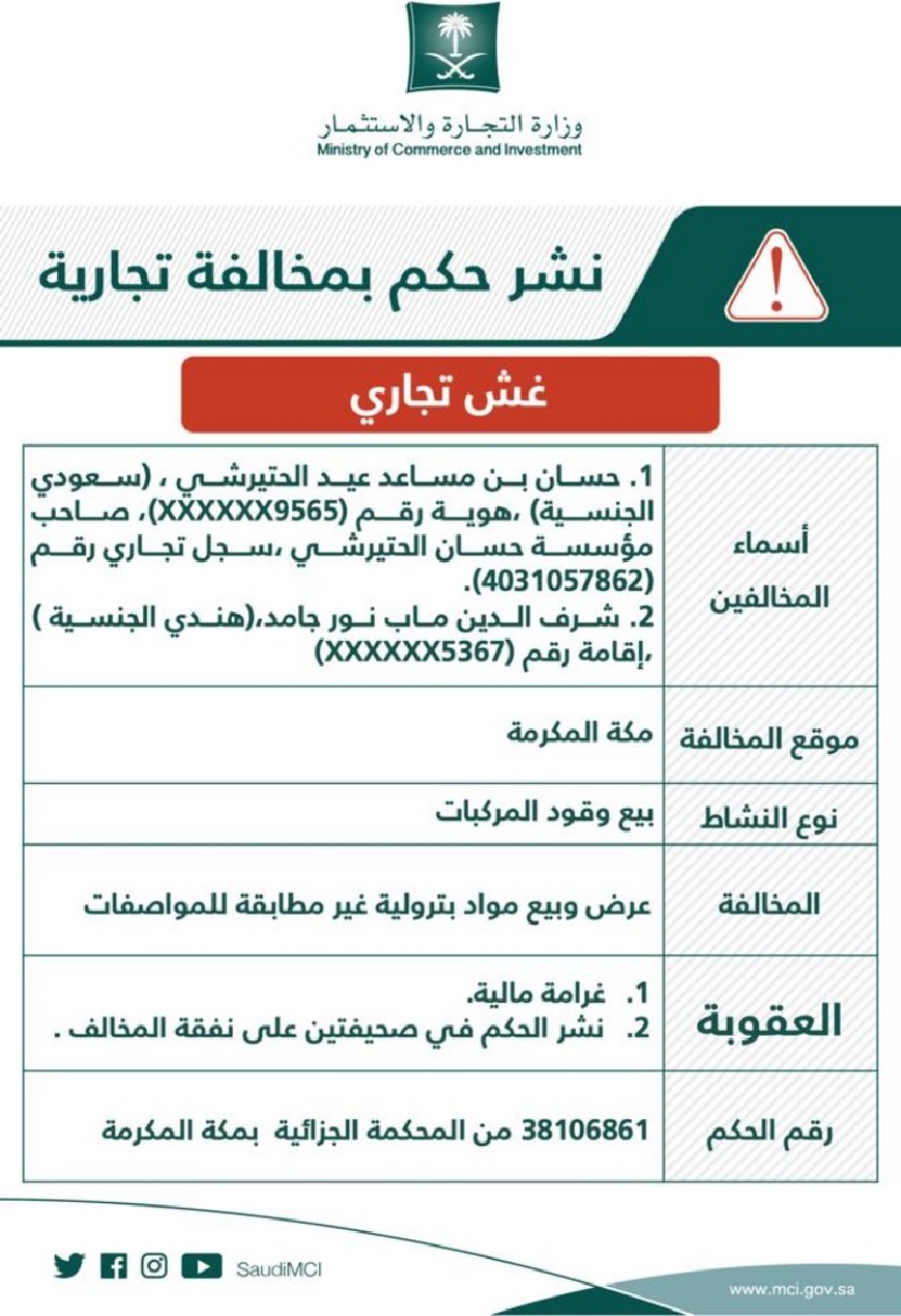 شهرت وزارة التجارة والاستثمار، الاثنين (الأول من يوليو 2019م)، بمستأجر لمحطة وقود بمكة المكرمة والمدير المسؤول من جنسية هندية وذلك إثر ثبوت مخالفتهما لنظام مكافحة الغش التجاري وعرض وبيع مواد بترولية غير مطابقة للمواصفات والمقاييس وهو ما يعد غشاً وتضليلاً للمستهلك.