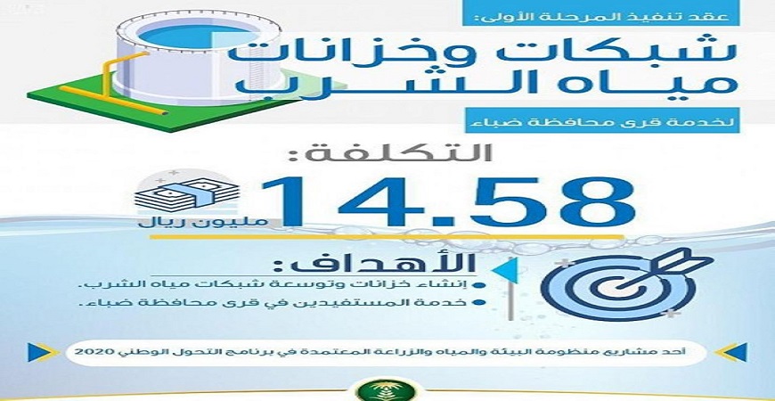 وأضافت: أن عقد مشروع المرحلة الأولى من استكمال إنشاء شبكات وخزانات مياه الشرب لقرى محافظة ضباء بلغت تكلفته الإجمالية نحو 14.58 مليون ريال، مشيرة إلى أن المشروع يهدف إلى إنشاء خزانات وخطوط ناقلة وتوسعة شبكات مياه الشرب لخدمة قرى محافظة ضباء في منطقة تبوك.
