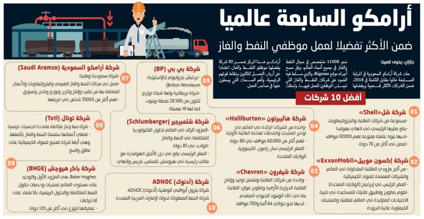 حلت شركة أرامكو السعودية، في المرتبة السابعة عالميا مقابل الثامنة في 2018، ضمن الشركات الأكثر شعبية ويفضلها نحو 11000 متخصص في مجال النفط والغاز في جميع أنحاء العالم، وفق مسح أجراه موقع Rigzone، والذي سلّط فيه الضوء على شركات النفط والغاز التي تجذب الموظفين للعمل فيها.