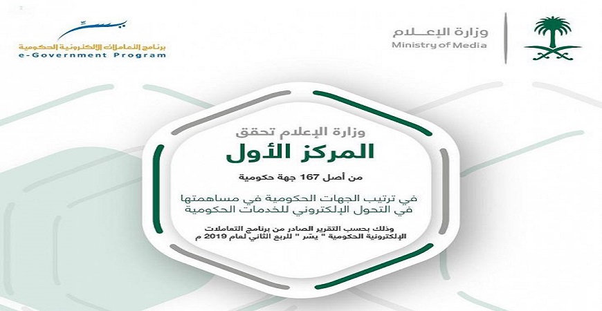 حققت وزارة الإعلام، المركز الأول في ترتيب الجهات الحكومية في إسهاماتها في التحول الإلكتروني للخدمات الإلكترونية، من أصل 167 جهة حكومية، بنسبة 87.85% في مؤشر مستوى نضج تحول الخِدْمات الحكومية الرئيسية «عالية التأثير» إلكترونيًا، وذلك بحسب التقرير الصادر عن برنامج التعاملات الإلكترونية الحكومية «يسّر» للربع الثاني لعام 2019م.