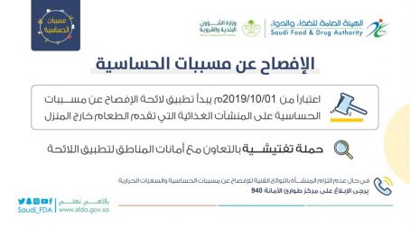 وكانت الهيئة وجّهت تعميماً إلى المنشآت الغذائية بالإفصاح عن مسببات الحساسية في قائمة الوجبات التي تقدمها، حيث منحت مهلة للمنشآت المعنية لتصحيح أوضاعها حتى تاريخ 30-9-2019.