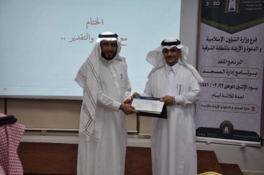 أقامت ادارة المساجد والدعوة والارشاد بالأحساء البرنامج التدريبي (إدارة المسجد) والموجهة للأئمة والمؤذنين وذلك مساء يوم امس الاثنين بقاعة الإدارة وبحضور مدير ادارة مساجد الاحساء الأستاذ عبدالعزيز بن سالم الكليب وفضيلة الشيخ الدكتور فهد بن سليمان الخليفة مدير إدارة الدعوة والإرشاد بالقصيم ومدير معهد الأئمة والخطباء سابقاً.