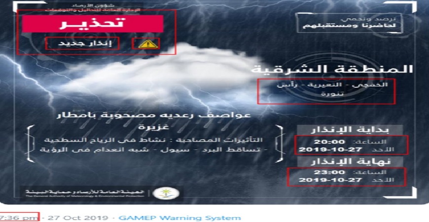 تعرّضت هيئة الأرصاد وحماية البيئة، مساء الأحد (27 أكتوبر 2019م)، إلى هجومٍ كاسحٍ بسبب تأخير التنبيه عن عاصفة حفر الباطن المفعمة بالبرد التي كشفت مديرية الدفاع المدني بالشرقية، عن حصيلة تلك الأمطار، مبينة أنها أسفرت عن ١١ إصابة، و٧ وفيات، وإخلاء ١٦ شخصاً، وتمّ تلقي ١١٧٦ بلاغاً؛ باشر منها ٤ حالات احتجاز لأشخاص، واحتجاز مركبة واحدة.