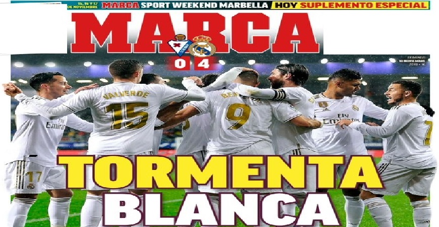 وأضافت: “ريال مدريد يُطلق عاصفة من اللعب والأهداف ضد إيبار، وعرض عظيم من فريق زيدان في أفضل مبارياته”.