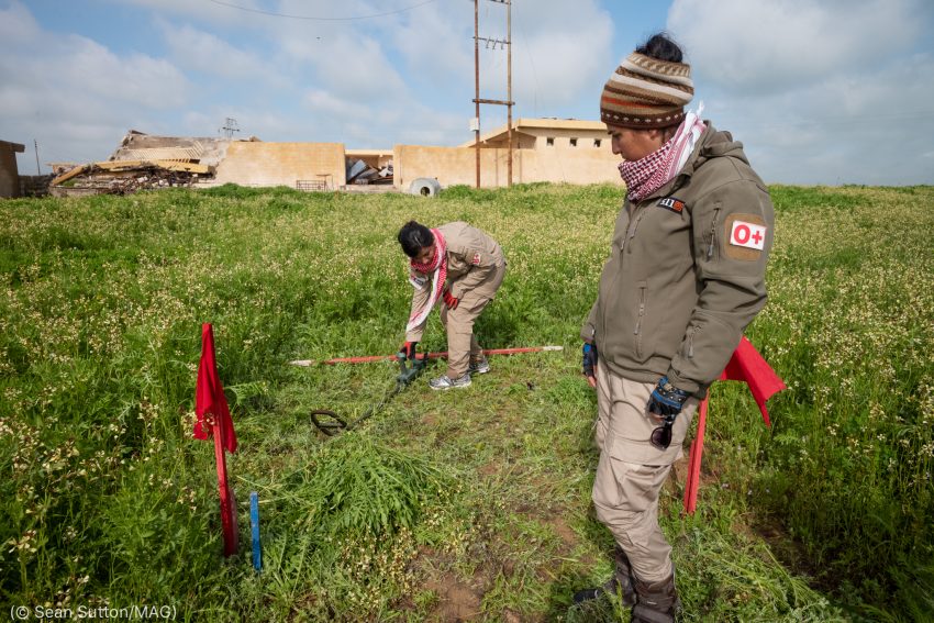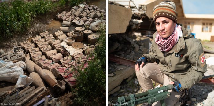 وتعمل النساء وزملاؤهن، والعديد منهن أيضًا نساء إيزيديات، لساعات طويلة في ظروف خطيرة لإزالة الألغام الأرضية والأجهزة المتفجرة اليدوية الصنع التي لم تنفجر وغيرها من المواد الخطرة المتفجرة حتى تتمكن العائلات من الرجوع وتعود الحياة إلى طبيعتها.