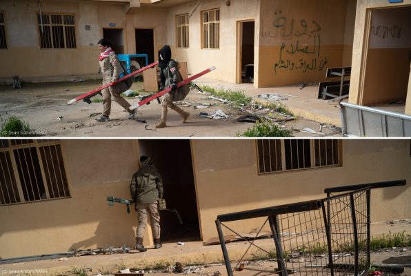 عضوات فريق العمل على إزالة الألغام يقمن بإزالة الألغام من مدرسة دمر معظمها وكانت تستخدمها داعش كمستشفى. (© Sean Sutton/MAG)