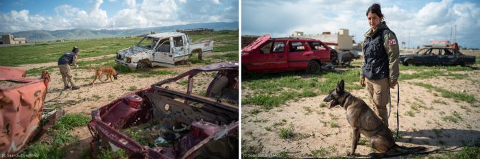 إلى اليسار: حليمة تسير مع كلبها آرون في العراق. غادرت هي وعائلتها بلدة كاناسر في العام 2014 عندما جاء تنظيم داعش. إلى اليمين: فيان، مدربة كلاب، تقف مع الكلب إكس لانغ. (© Sean Sutton/MAG)