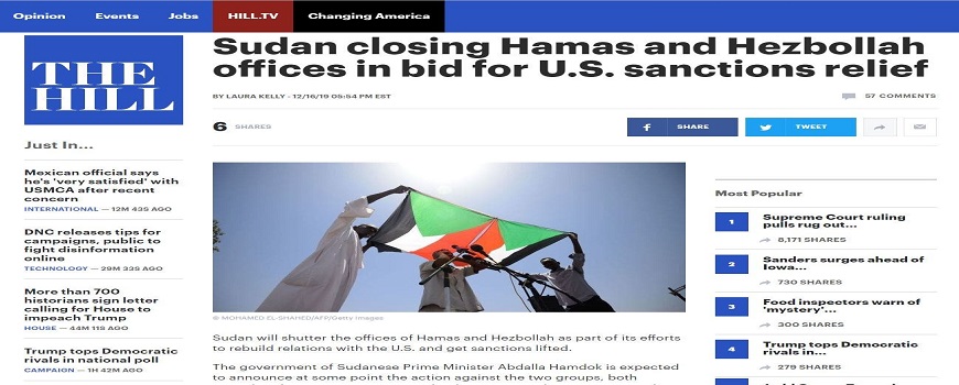 كشف موقع صحيفة «ذاهيل» The Hill الأميركية، في تقرير نشرته الاثنين (16 ديسمبر 2019م)، أن السودان يعتزم إغلاق مكاتب ميليشيات حزب الله وحماس كجزء من جهوده لإعادة بناء العلاقات مع الولايات المتحدة ورفع العقوبات وإزالة السودان من قائمة الدول الراعية للإرهاب.