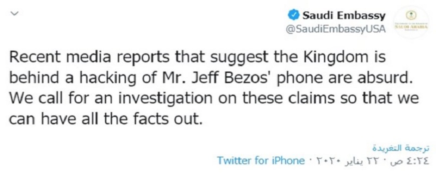 كذّبت السفارة السعودية لدى واشنطن، الأربعاء (22 يناير 2020م)، التقارير الإعلامية التي زعمت أن السعودية خلف قرصنة هاتف الملياردير الأمريكي مؤسس شركة أمازون جيف بيزوس.