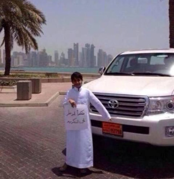 تناقل مغردون سعوديون على موقع التواصل الاجتماعي “تويتر” صورة لطفل سعودي يقف أمام سيارة من نوع “تويوتا لاندكروزر” أهداه إياها أمير قطر الشيخ تميم بن حمد آل ثاني بعد أن غير اسمه من بشار إلى تميم، ويحمل الطفل لافتة كتب عليها “شكراً أمير قطر على التكريم”.
