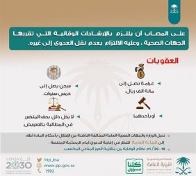 وأوضحت أنه على المصاب أن يلتزم بالإرشادات الوقائية التي تقررها الجهات الصحية، وعليه الالتزام بعدم نقل العدوى إلى غيره، وأن العقوبات على المخالفين هي غرامة تصل إلى 100 ألف ريال، والسجن لمدة تصل إلى 5 سنوات، أو بأحدهما، بما لا يخل بحق المتضرر في المطالبة بالتعويض.