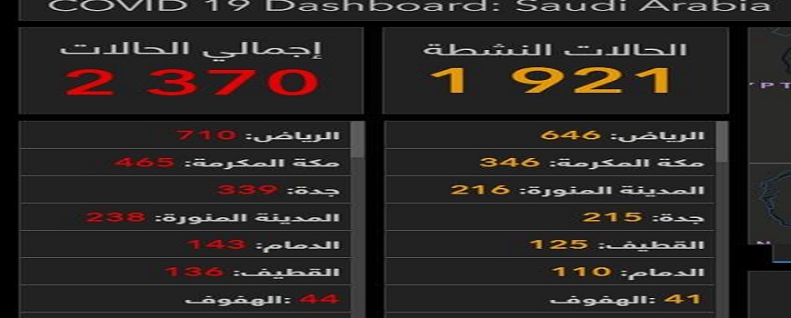 أعلن موقع وزارة الصحة المخصص لتحديث حالات فيروس كورونا الجديد (كوفيد 19) في المملكة، الأحد «الخامس من ابريل 2020م»، عن رصد وتسجيل 191 حالة جديدة وارتفاع إجمالي حالات الإصابة إلى 2370 إصابة.