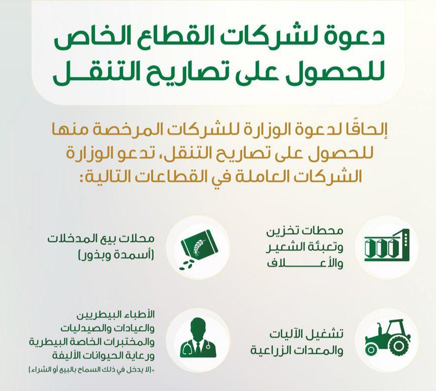وحثت “البيئة” الشركات العاملة في قطاعات محطات تخزين وتعبئة الشعير والأعلاف، ومحلات بيع المدخلات (أسمدة وبذور ومبيدات)، وتشغيل الآليات والمعدات الزراعية، والأطباء البيطريين والعيادات والصيدليات والمختبرات الخاصة البيطرية، ورعاية الحيوانات الأليفة (لا يدخل في ذلك السماح بالبيع أو الشراء)، إلى سرعة التقديم للحصول على تلك التصاريح.