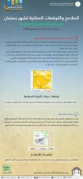 وبناءً على دراسة المعلومات التاريخية تشير التوقعات الاحتمالية لمناخ المملكة -بمشيئة الله تعالى- خلال شهر رمضان المبارك إلى أمطار أعلى من المعدل الطبيعي على شمال غرب المملكة العربية السعودية وحول المعدل على أغلب مناطق المملكة، فيما يتوقع أن تكون درجات الحرارة السطحية أعلى من المعدل على جميع أرجاء المملكة تصل إلى درجة (1,0) مئوية.